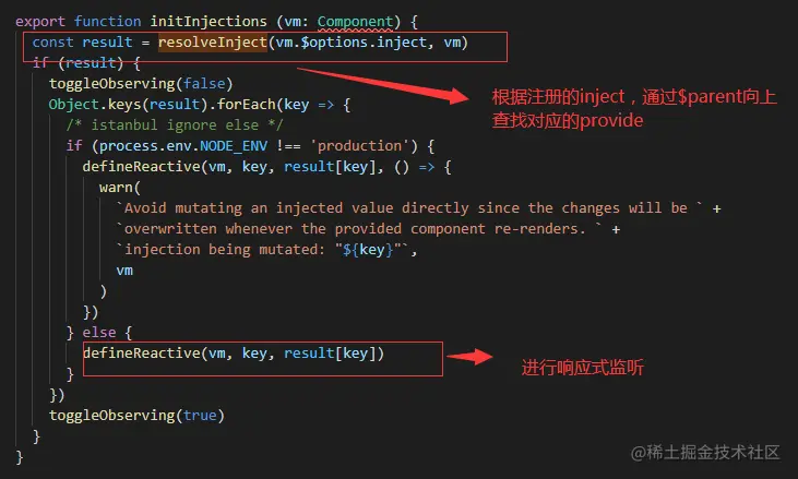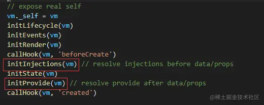 组件实例初始化的时候会调用Vue.prototype._init,vm._init中在data/props前面调用了initInjections,在data/props后面调用了initProvide
