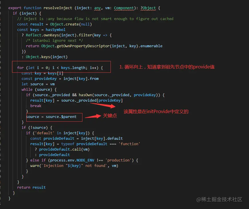 - 获取vm.$options.inject,通过resolveInject方法找到对应的key集合;