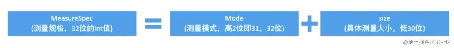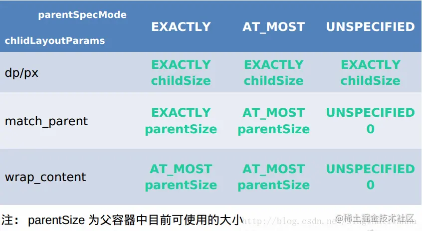 测量规格,封装了父容器对 view 的布局上的限制,内部提供了宽高的信息( SpecMode 、 SpecSize ),SpecSize是指在某种SpecMode下的参考尺寸,其中SpecMode 有如下三种: