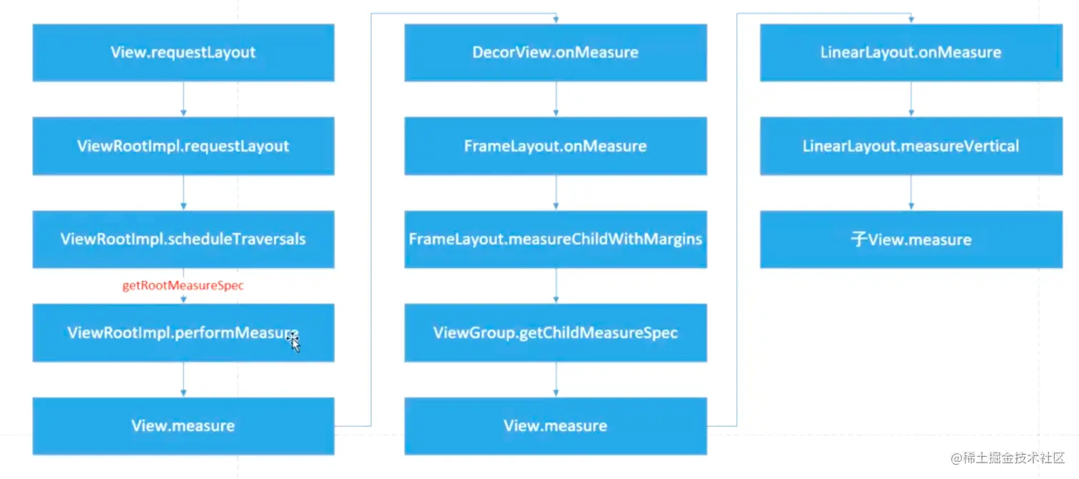 一定要记住: 无论是measure过程、layout过程还是draw过程,永远都是从view树的根节点开始测量或计算(即从树的顶端开始),一层一层、一个分支一个分支地进行(即树形递归),最终计算整个view树中各个view,最终确定整个view树的相关属性。