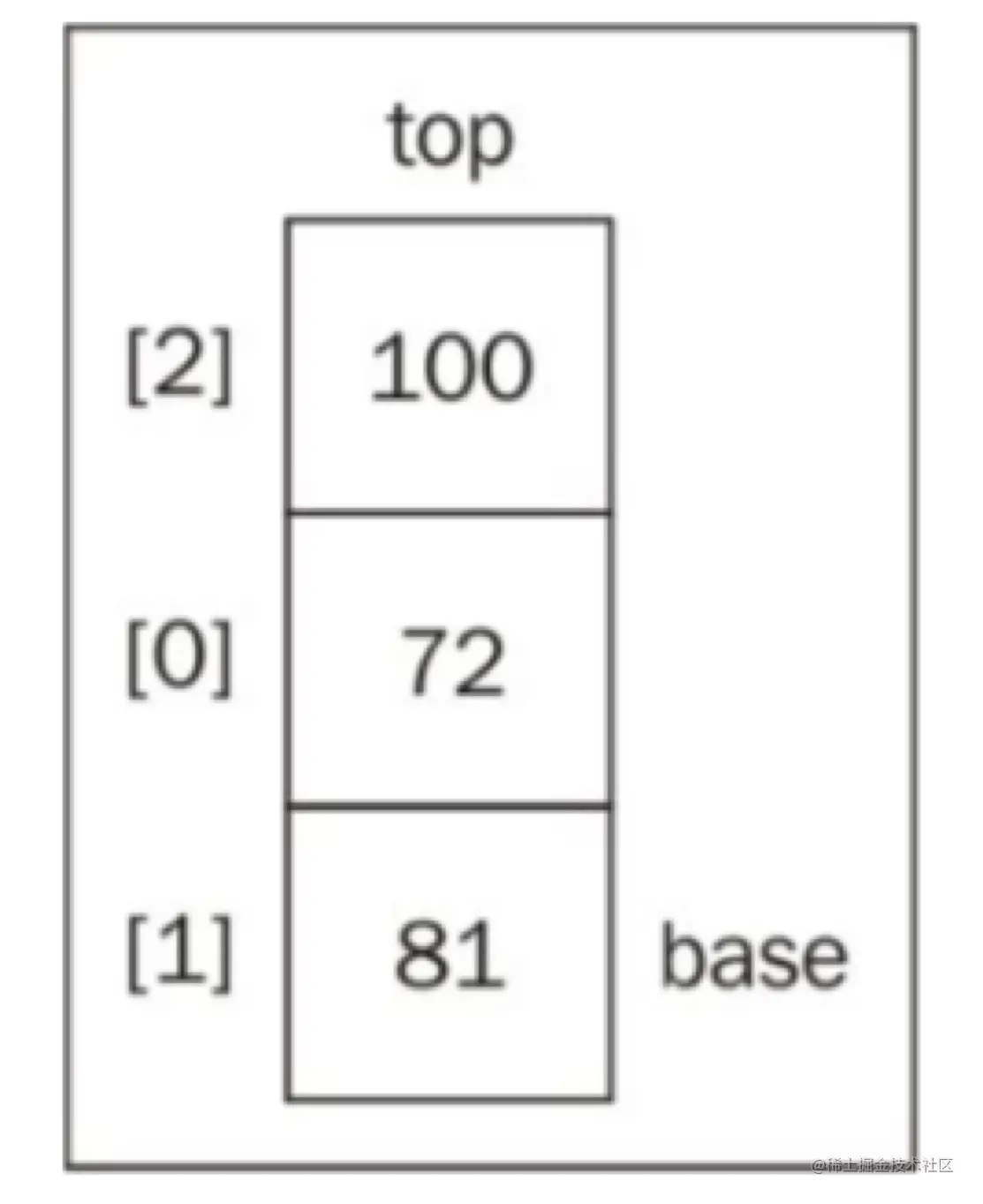 如上图所示,我们有一个有三个元素的栈,因此内部数组的长度为3。内部数组最后一个元素的下标为2。所以数组最后一个元素的表达式为 length -1。
