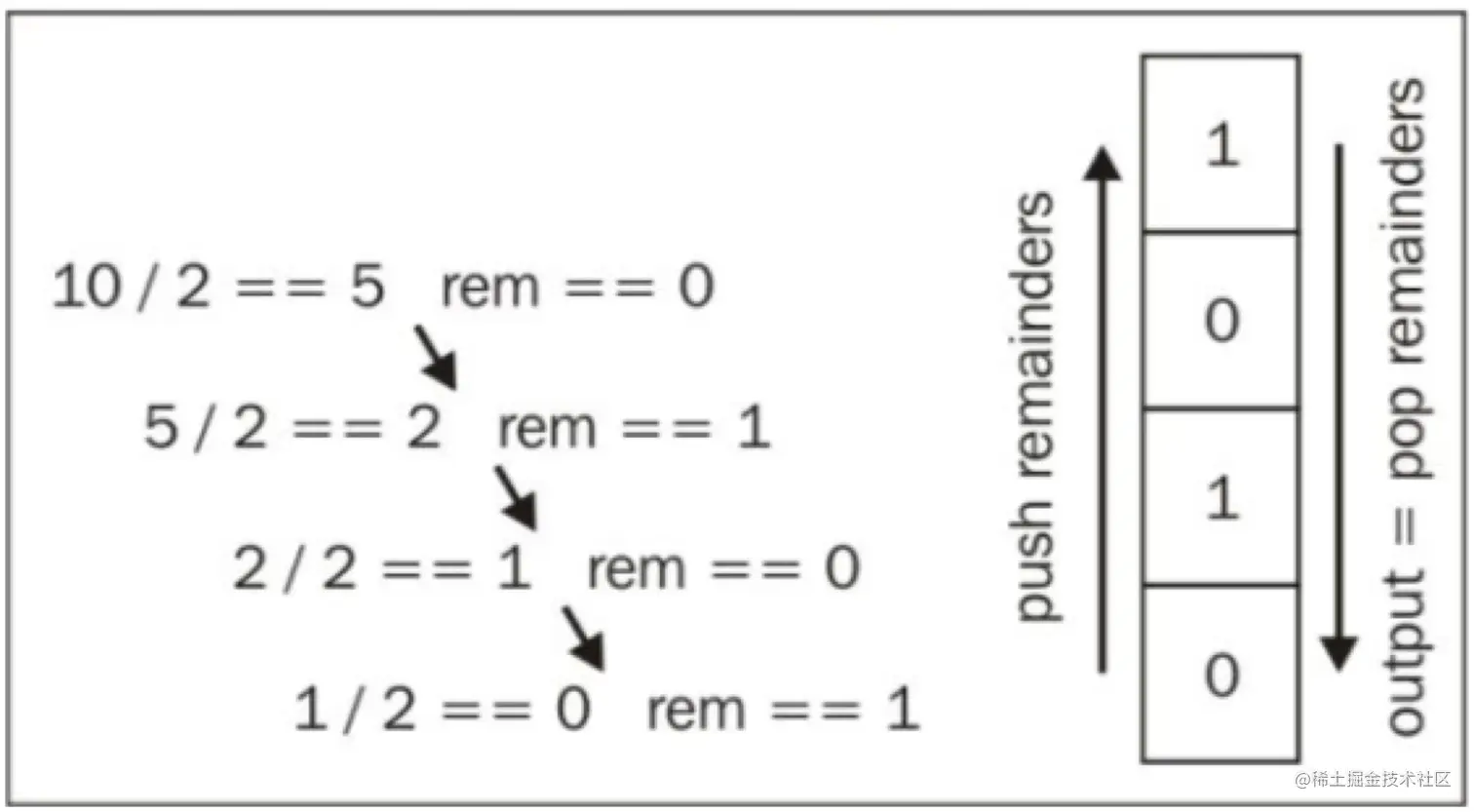 在这段代码中,当decNumber不等于零时***(行 {1}),我们将会得到decNumber除以2的余数,并将之push进remStack中(行 {2} 和 {3}),之后,我们将会通过除以2的方式更新decNumber(行 {4})。有一个值得注意的地方是,虽然JavaScript有数值类型的变量,但是它不会区分整数和小数。为此,我们需要用Math.floor方法来获得商的整数部分。最后,我们使用pop方法,直到remStack为空为止(行 {5})***,把被删除的元素连接成一个字符串。