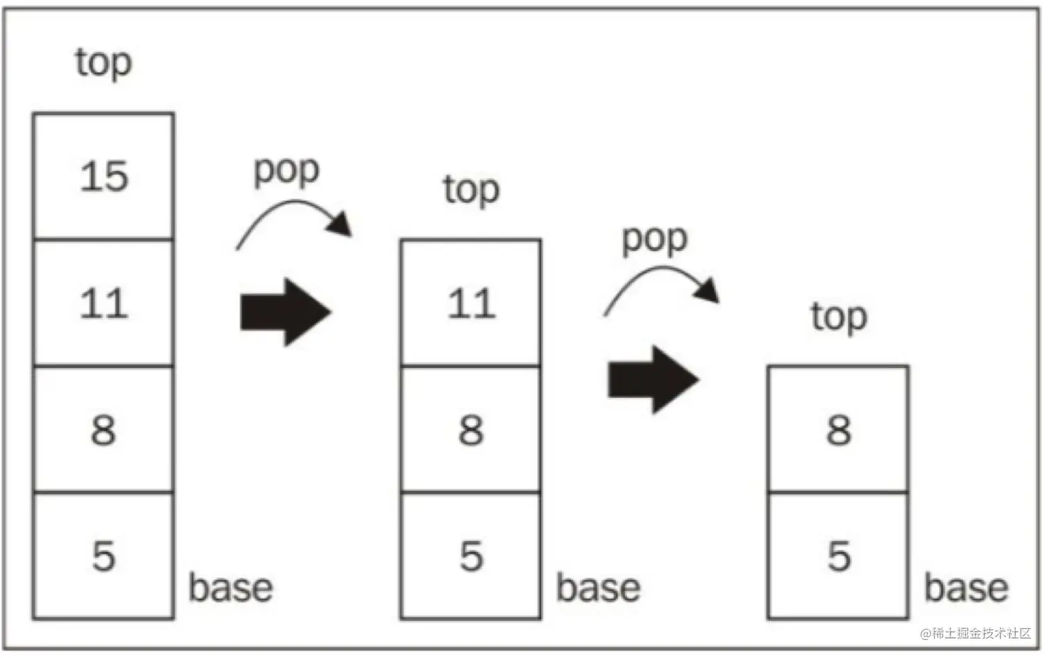 在我们调用pop方法之前,stack变量是有成员的。调用了两次pop方法后,stack变量就只有两个成员了: 5 和 8。下图展示了调用pop方法后对stack的影响: