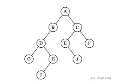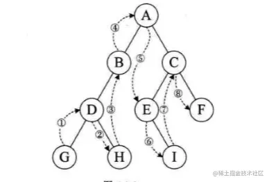 若树为空,则空操作返回,否则从左到右先叶子后结点的方式遍历访问左右子树,最后是访问根结点。遍历的顺序为: GHDBIEFCA。