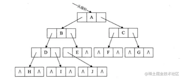 二叉树每个节点最多有两个孩子,所以设计为一个数据域和两个指针域。我们称这样的链表叫做二叉链表