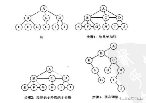 去线。对树中每个结点,保留它与第一个孩子结点的连线,删除它与其他孩子结点之间的连线。
