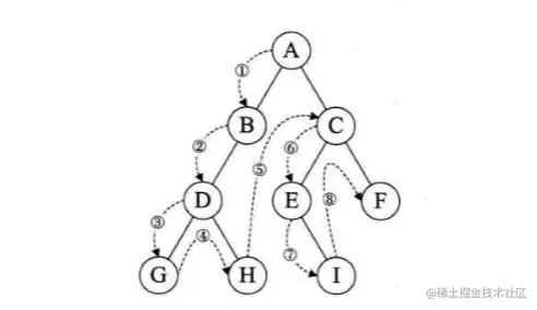 若二叉树为空,则空操作返回,否则先访问根结点,然后前序遍历左子树,再前序遍历右子树。遍历的顺序为: ABDGHCEIF。