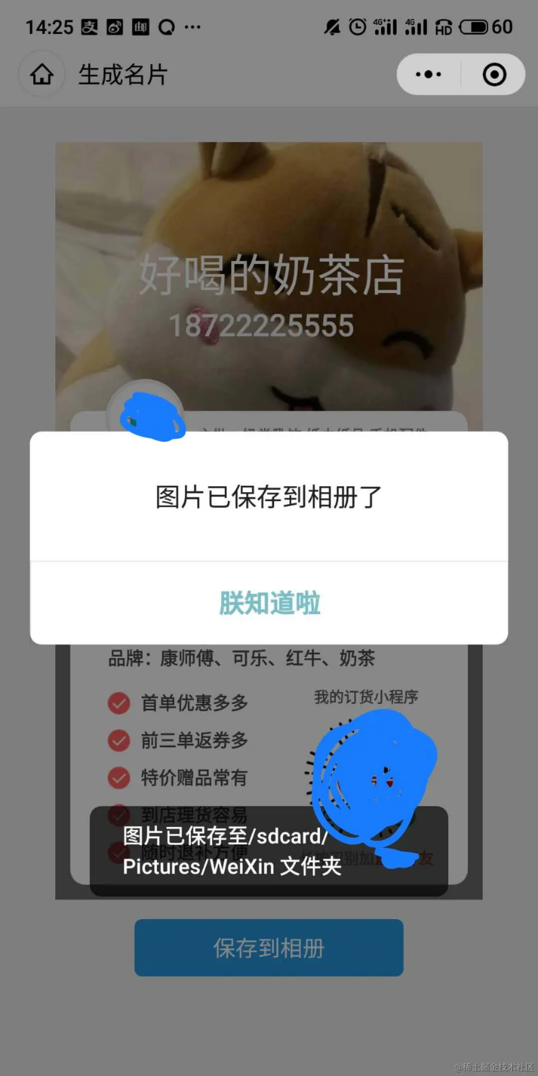 4.第四张图片(如果用户点击”拒绝“则弹出提示框,这里是因为如果用户点击”拒绝“后我们再点击”保存到相册“按钮后不会再调起授权权限的弹窗,所以需要这一步操作)