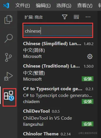 - Chinese:中文汉化插件,VScode默认是英文界面,为了方便咱给他改成中文的。在搜索栏搜索Chinese,选则中文简体点击右下角的安装(我这里安装过了所以没有那个安装按钮)。