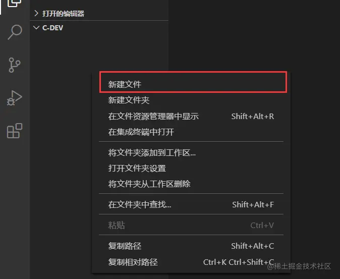 搞定之后我们来写一个C文件测试一下,点击左上角的文件-->打开文件夹-->选择一个空文件夹打开,然后右键-->新建文件: