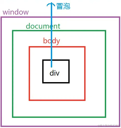 概念:事件开始时由最具体的元素接受,然后逐级向上传播到较为不具体的节点。比如事件是由div接受的,然后向上冒泡,到body、html、document、window。