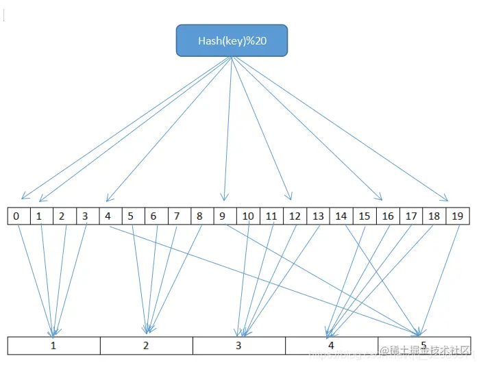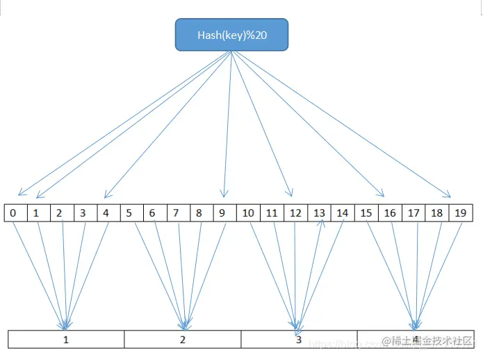 带虚拟节点的一致性哈希方法,核心思想是根据每个节点的性能,为每个节点划分不同数量的虚拟节点,并将这些虚拟节点映射到哈希环中,然后再按照一致性哈希算法进行数据映射和存储。为了演示方便,假设有20个虚拟节点,4个分片每个分片的性能都差不多,实际我们一般使用较多的虚拟节点如10240,其映射关系如下图: