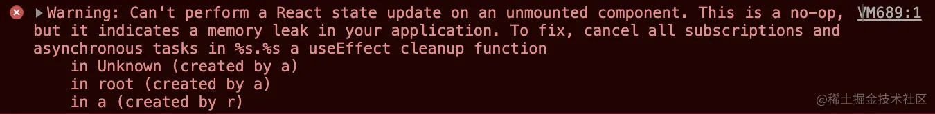 Warning: Can't perform a React state update on an unmounted component. This is a no-op, but it indicates a memory leak in your application. To fix, cancel all subscriptions and asynchronous tasks in %s.%s a useEffect cleanup function.原因说的很明显,是在组件卸载后,还调用了setState,造成了内存泄漏。