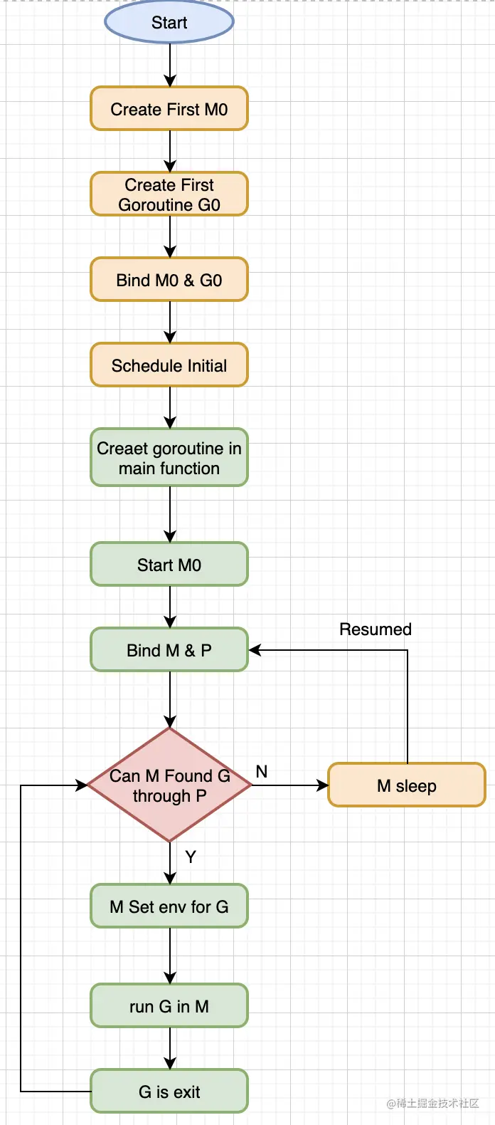 首先创建一个G对象,然后G被保存在P的本地队列或者全局队列(global queue)。这时P会唤醒一个M。P按照它的执行顺序继续执行任务。M寻找一个空闲的P,如果找得到,将G移动到它自己。然后M执行一个调度循环:调用G对象->执行->清理线程->继续寻找Goroutine。