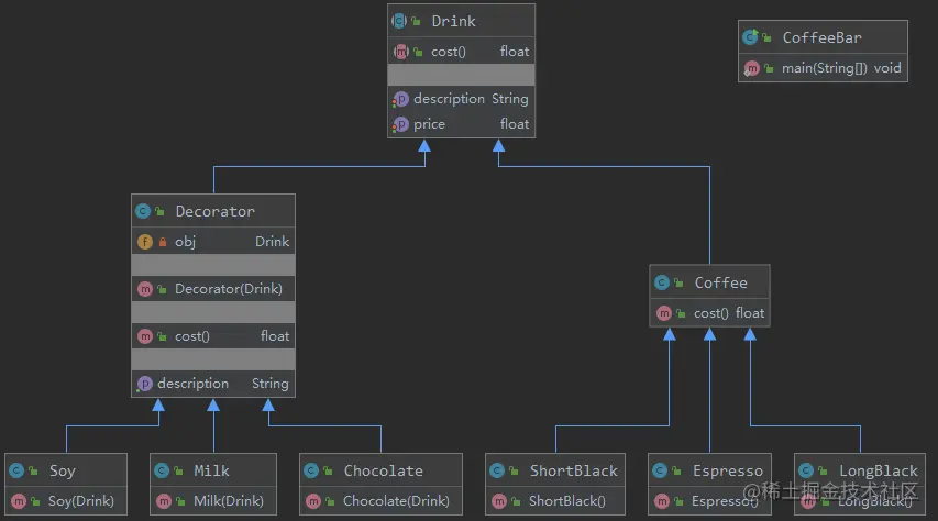 3)Decorator 是一个装饰类,含有一个被装饰的对象(Drink obj);