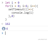 因为这里使用了setTimeout(),setTimeout是一个异步任务,执行到这里的操作会被浏览器丢到另一个任务队列里去,浏览器这时候会继续执行for循环。每一次for循环的时候,setTimeout都执行一次,但是里面的函数没有被执行,而是被放到了任务队列里面,等待执行,for循环了6次,就放了6次,当主线程执行完成后,才进入任务队列里面执行。这时候因为for循环i=6了,所以输出的全部都是6。