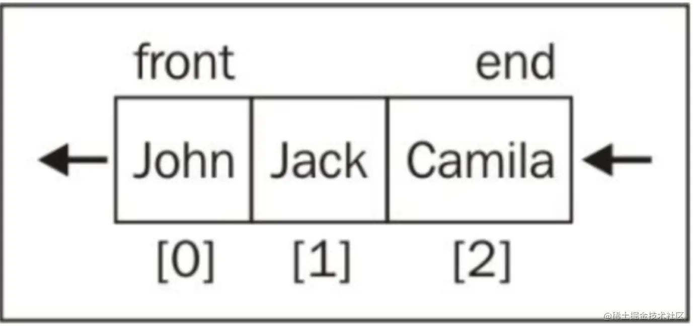 如果我们查看队列的成员,其输出为 John、Jack 和 Camila。队列的大小为3因为队列有3个成员。