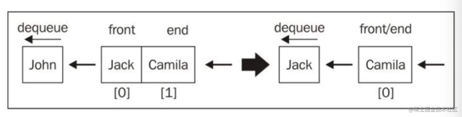 之后,我们用了两次dequeue方法来删除队列前面的成员:
