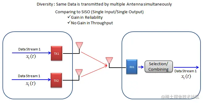 从图中可以看出,在这种发送分集配置中,一个数据流通过不同的路径到达多个接收天线,这意味着接收方可以收到相同数据的多个版本。 从这些版本中,接收方可以选择最佳版本或将它们全部按照一定算法组合在一起, 通过这样处理,可以提高通信可靠性(减少错误),但是在数据吞吐量方面没有优势。