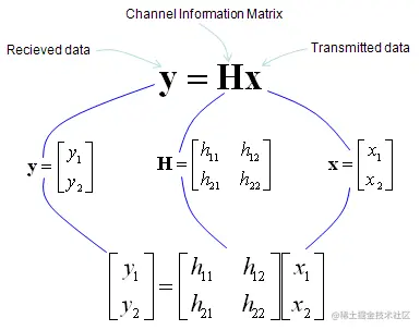 上面已经建模了2*2 MIMO 的传输模型,需要在接收侧根据混合数据去分离出stream1和stream2, 下面就是解数据的数学建模。