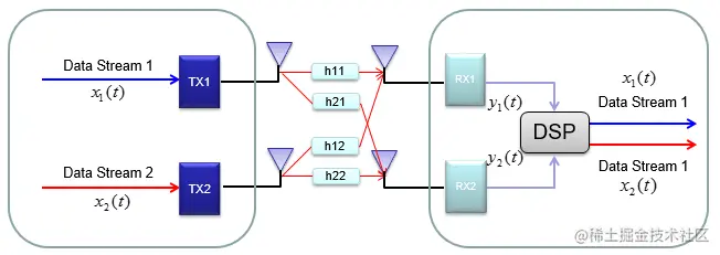 下面介绍MIMO的数学模型,这里只是简单说明,并不严谨,严谨数学推导可以找相关的专业无线通讯原理书籍进行学习。 下面先从两发两收的模型开始介绍,如图,有两个数据流stream1 和 stream2 同时通过发送天线TX1和发送天线TX2发送数据,通过空口,在接收侧接收天线RX1和RX2同时收到了stream1和stream2两组数据的混合,通过一定算法可以从这个混合数据中分离出stream1和steram2, 如何分离就是MIMO的核心算法。