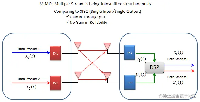 下图显示了MIMO的一个简化的概念。 与MIMO同步,多个独立数据流可以同时传输,因此与SISO(单输入单输出)情况相比,它可以实现更高的数据吞吐量。 但是,与SISO情况相比,在数据传输的可靠性(例如,更少的错误)方面几乎没有优势。