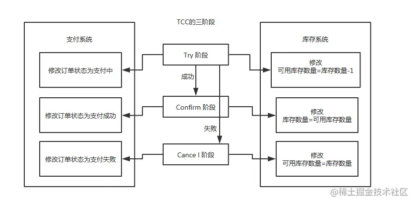 如果Try阶段执行失败,执行Cancel阶段,将订单状态修改为支付失败,可用库存数量修改为库存剩余数量。