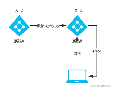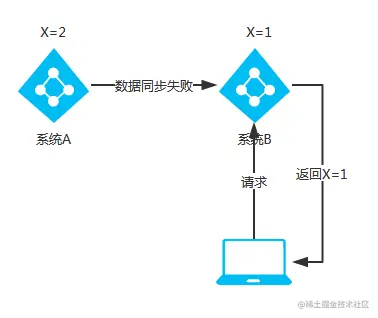 这时当出现网络分区后,如果系统A与系统B之间的数据同步数据失败,系统B的X=1