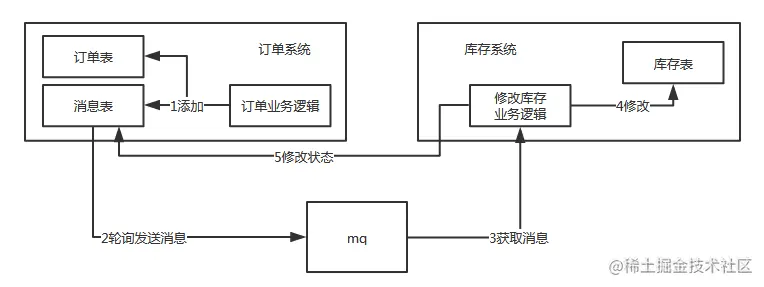 然后通过轮询的方式去查询消息表,将消息推送到MQ,库存系统去消费MQ。