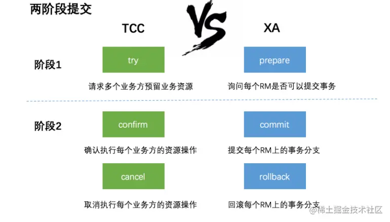 在阶段1: 在XA中,各个RM准备提交各自的事务分支,事实上就是准备提交资源的更新操作(insert、delete、update等);而在TCC中,是主业务活动请求(try)各个从业务服务预留资源。