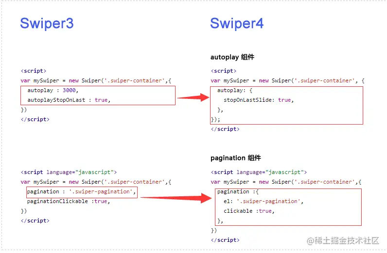 首页的制作中,轮播图部分我用的是Swiper3,引入部分在此不再赘述,但是Swiper3和Swiper4在SwiperOption里面还是有一些变化,我当时就是没有在意自己下的是哪个版本,调试了很久没有出效果,后面才发现是SwiperOption的问题,这里是有坑的。区别见下图: