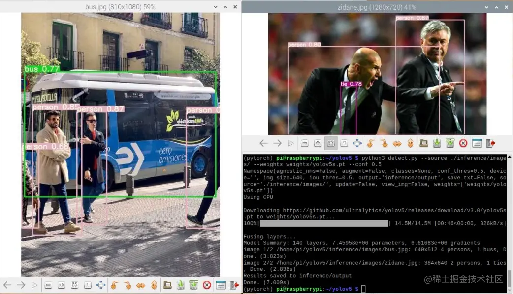 测试用最小的模型 yolov5s 对两张图片进行目标检测,识别率还不错,但速度一般,一张 3.8 秒,一张 2.8 秒,大约 0.3fps,后续我们可以对比一下openvino 加速的效果。