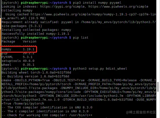 务必确认一下虚拟环境下,已经安装了numpy。没有numpy的话也能成功编译,但是编译出来的PyTorch 不支持numpy。PyTorch was compiled without NumPy support。