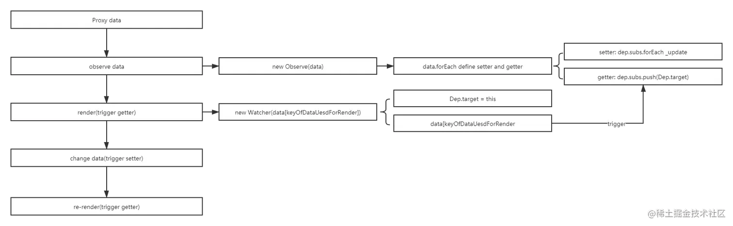 - 添加新的Watcher,Watcher构造过程中,会首先将Dep.target赋值为自己,然后手动调用一遍getter,这样就能触发getter中将Dep.target加入到subs中的逻辑