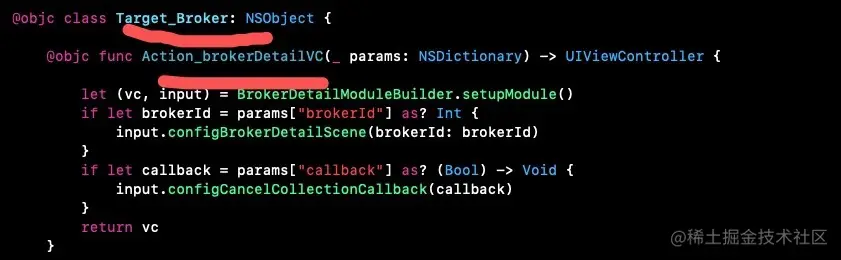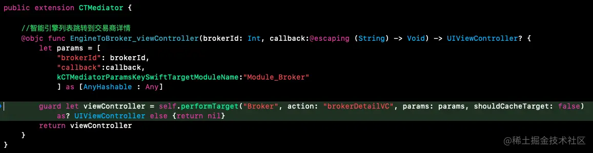 3.3 开始进入EngineToBroker_viewController,调用self.performTarget("Broker", action: "brokerDetailVC", params: params, shouldCacheTarget: false)【返回vc】