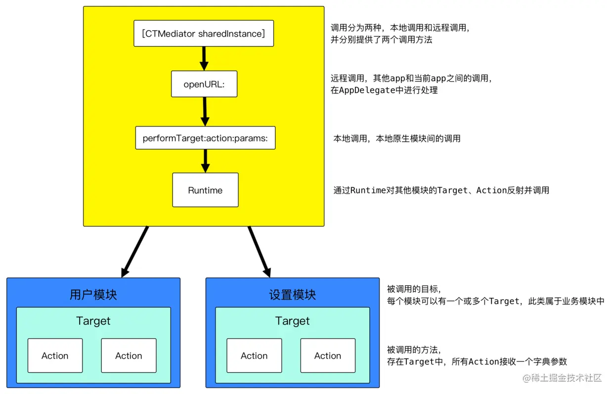 远程应用的调取:远程应用是通过openURL的方式,由iOS 系统根据info.plist里的scheme配置用来可以找到响应的URL的应用,应用直接通过AppDelegate接收到URL之后,调用了CTMediator的OpenURL方法将接收到的信息传入进去.当然,CTMediator也可以用CTMediator的openURL:options:方式顺便将option也接收,这取决于是否包含了option数据,传入URL之后,CTMediator进行解析URL,将请求的路由到相对应的target-action中,随后的过程就变成了上面的本地应用调用过程了,最终完成了响应.