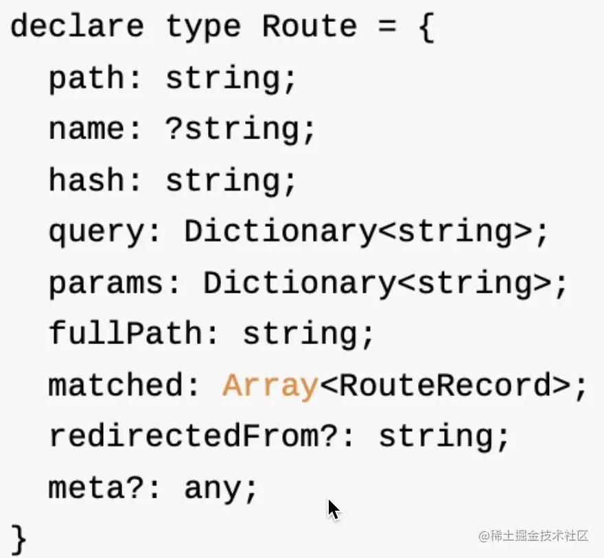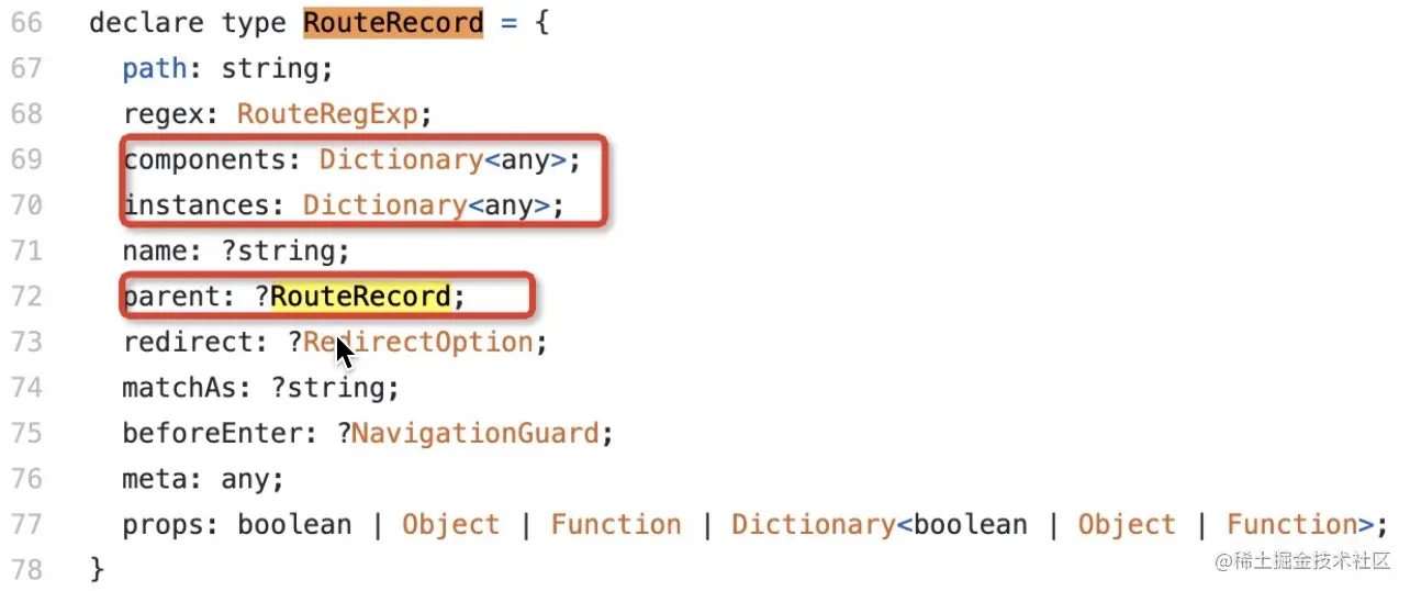 它的定义如下所示,与Route还蛮像的,但是路由记录中包含了vue组件,在执行组件内的导航守卫时起到了很大的作用。