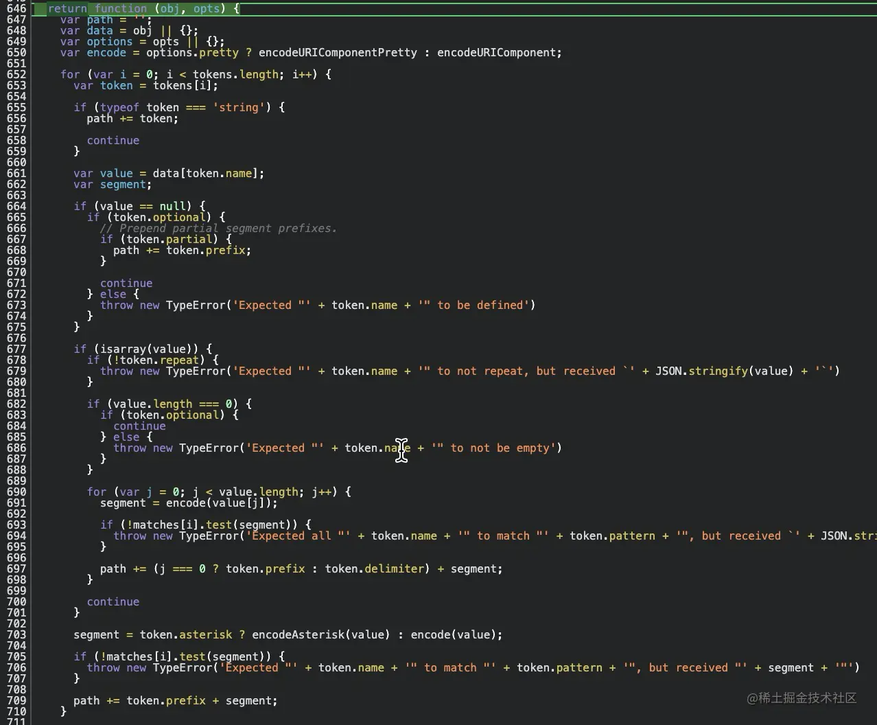 图24 在获得了 filter变量 后,在第946行开始执行它,传入的参数是:params: { mileage: 0 }和{ pretty: true } 那么我们来看下 tokensToFunction方法 返回的模板函数的全貌,见图28。该方法就是遍历tokens(值可见图26)生成真正的path,而我们的例子中最终得到的path是空字符串在这个方法中就可以找到答案。