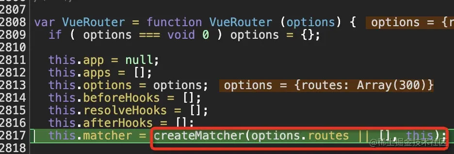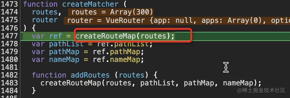 在new VueRouter的时候传入的routes数组,在createMatcher方法中解析routes(见图10),生成路由匹配器matcher。createMatcher方法内部又调用createRouteMap(见图11)来解析。