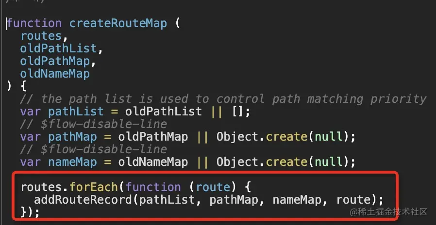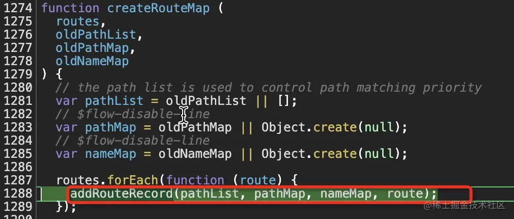 我们继续深入createRouteMap内部,发现它是遍历routes数组,调用 addRouteRecord 来维护 pathList, pathMap, nameMap这几个对象(见图12)。 addRouteRecord 的完整源码戳这里。