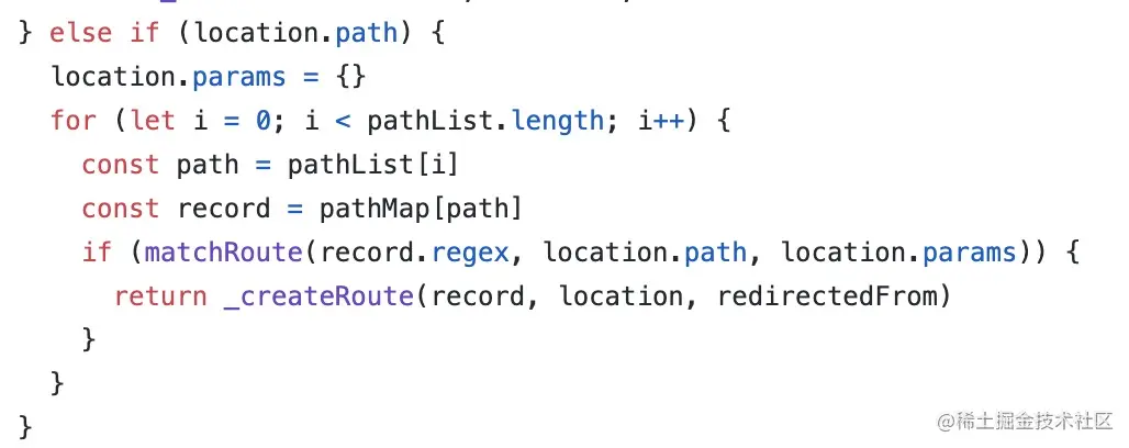 - 遍历路由地址数组pathList ,通过pathMap(存储着key:path -> value:RouteRecord)进行路由的匹配获得RouteRecord。