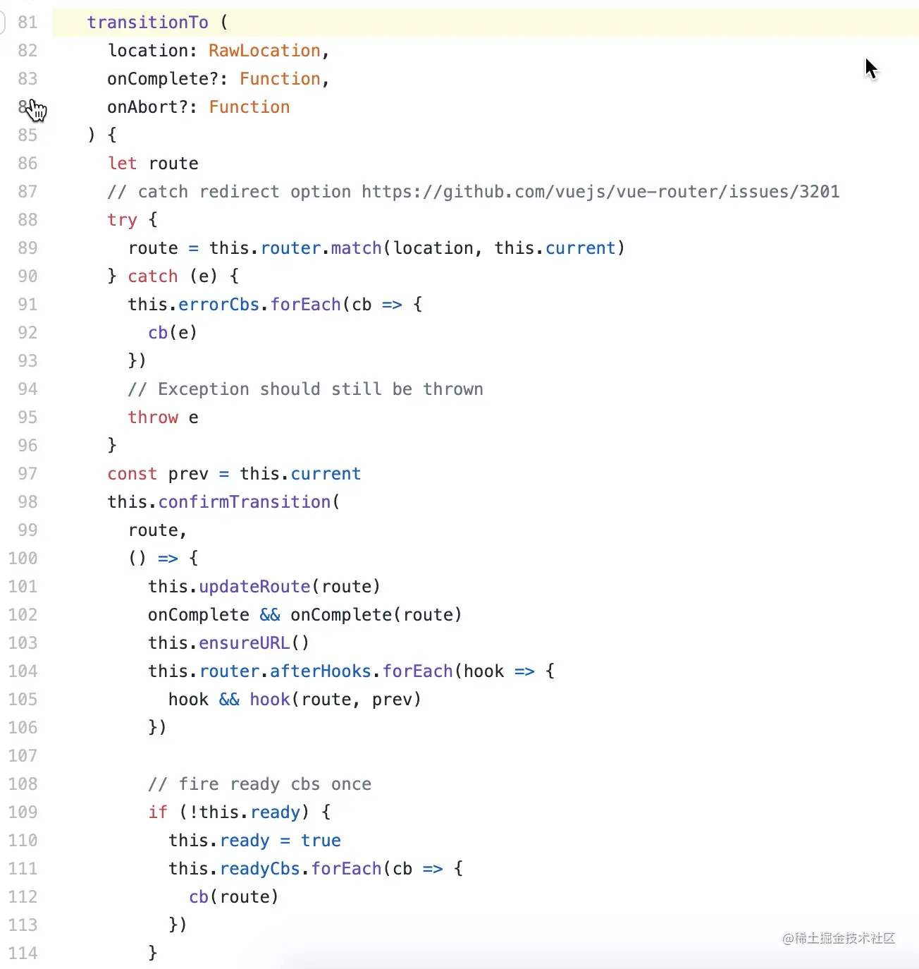 confirmTransition方法的定义如下所示,它传入的参数分别是:【2】路由匹配中解析出的路由route,完成后执行的函数 onComplete(下一节重点讲),以及失败后执行的函数 onAbort。