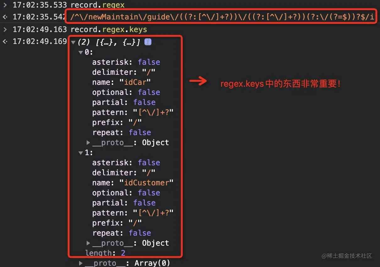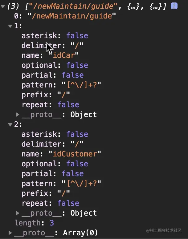 RouteRecord里面有个重点的东西:regex,它内部存储了解析出的动态路径参数,本例中要跳转的路由path为:'/newMaintain/guide/:idCar/:idCustomer' 。regex的内容如图4所示,重要的是regex.keys。它有什么用?后面可以通过 regex 和 router.params填充 path