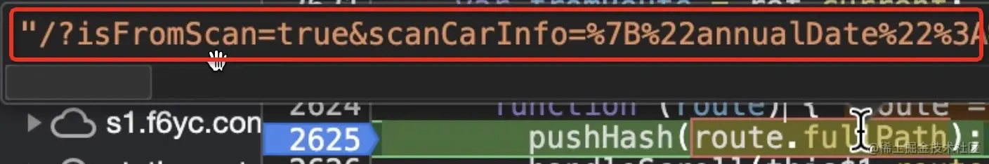 既然是url中的问题,那么首先从 **1.3.2 => 【5】更新当前路由,更新url **这边出发,问题出现在 pushHash方法 更新url的时候,这个url的值来源于:当前url截取‘#’之前的字符串 + route中的fullPath。那么问题就在于 route中的fullPath,果然打断点发现 fullPath如图21所示,完整的地址应该是:'/newMaintain/guide?isFromScan=true...' ,即path + query里拼接的值,而现在只有query里拼接的值。