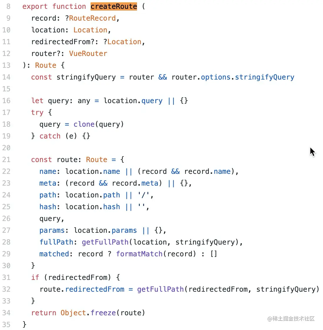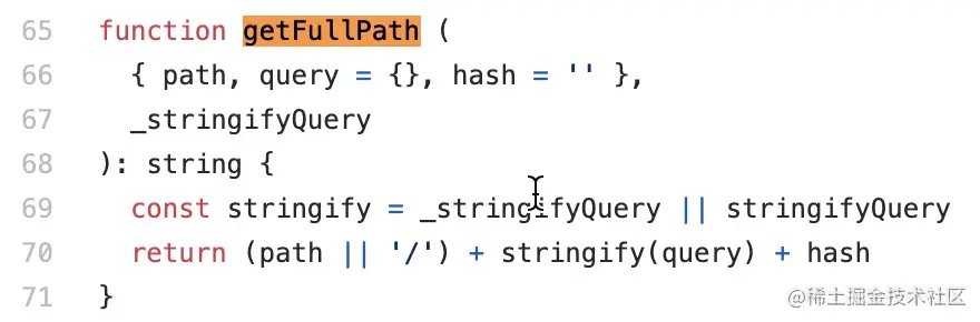 '/newMaintain/guide/:idCar/:idCustomer'用location.params 进行填充,获得完整的路由地址lcoation.path。 - 生成路由对象route,在本案例中它是调用 createRoute方法 生成的,这部分的源码戳这里,为方便查看留个图16。它内部主要是组成了路由对象route的各种属性:name/meta/path/hash/query/ params/matched/fullPath。并且把route通过Object.freeze设置为不可更改的。其中需要特别注意的是fullPath,它是后面拼接成完整的url的关键。fullPath是通过调用 getFullPath方法 形成的,代码截图如图17所示。stringifyQuery是将query对象转化为字符串的方法,默认的方式是以&拼接,以?开头,也可以传入自定义的转化方式,本例是采用默认的方式,然后将 lcoation.path 与转化后的query字符串拼接形成 fullPath。