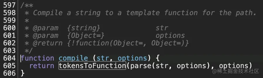 案例中首次解析 "/newMaintain/guide/:idCar/:idCustomer" 则走pathToRegexp_1.compile(path)),先来看下它的实现,见图25,这边使用了函数柯里化返回了个模板函数。compile的入参str就是 path,值为 "/newMaintain/guide/:idCar/:idCustomer",并且先调用 parse方法 将传入的地址进行转化,转化后的结果如图26所示。然后在调用 tokensToFunction方法 返回一个处理该path的函数。