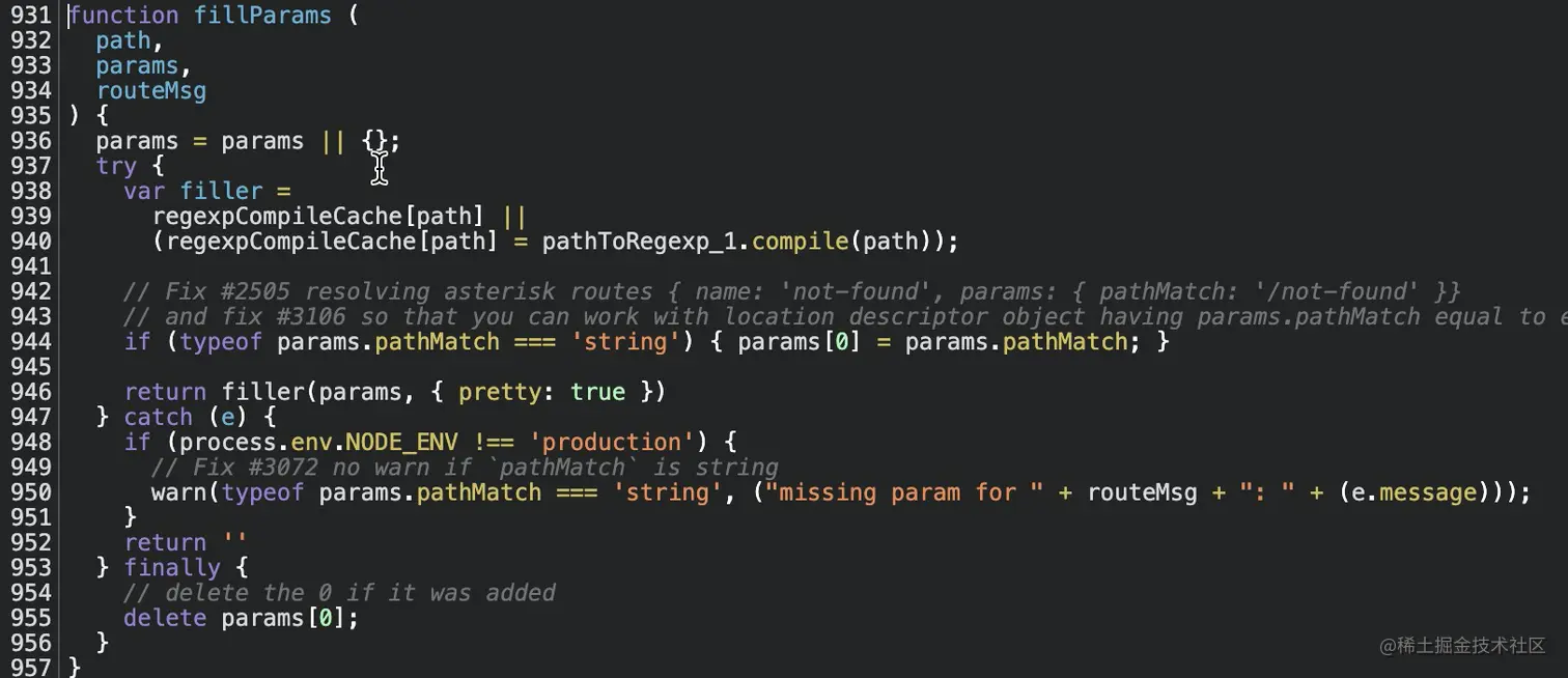 那我们这边看下该方法的实现,见图24。这边主要是通过 路径匹配引擎path-to-regexp 想要将 动态路由地址:"/newMaintain/guide/:idCar/:idCustomer"填充完。而且这边还对于 路径匹配引擎path-to-regexp 做了缓存将解析过的存储在 regexpCompileCache 中,若缓存中没有再调用pathToRegexp_1.compile(path)) 进行解析,并且把解析的结果缓存下来(第 938 - 940行)。然后在调用 filter方法 获得path。