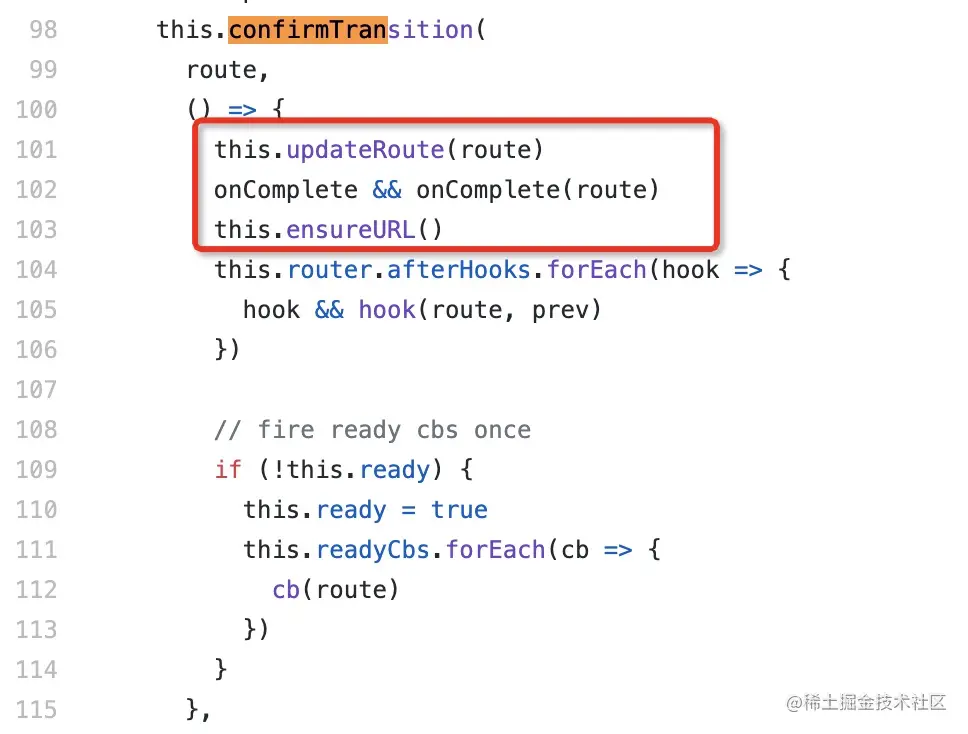 - 第101行:执行updateRoute方法,将要跳转的路由对象route更新为当前路由current;