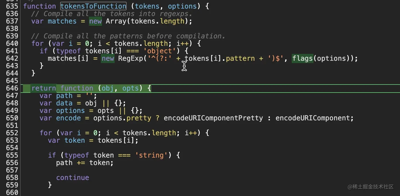 我们看下 tokensToFunction方法 内部(见图27),(1)将tokens(也就是图26的结果)转化为正则表达式存储在matches数组中。因此,本例中的matches 为 [empty, /^(?:[^\/]+?)$/i, /^(?:[^\/]+?)$/i ](2)返回一个模板函数(现在还未执行,先不讲),这个函数就是 图25 compile方法 返回的函数,对照 图24 中的 第936行 可知,filter这个变量中存储的也是这个函数。