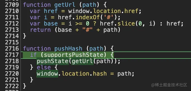 - pushHash:该方法的实现如图20,调用了这个方法后浏览器的地址栏就会发生更新。该方法首先判断当前浏览器是否支持history.pushState() 方法,若支持则调用该方法,则往浏览器会话的历史堆栈中添加一个记录,即可形成浏览器中的url。那么这个url的值来源于:当前url截取‘#’之前的字符串 + route中的fullPath。